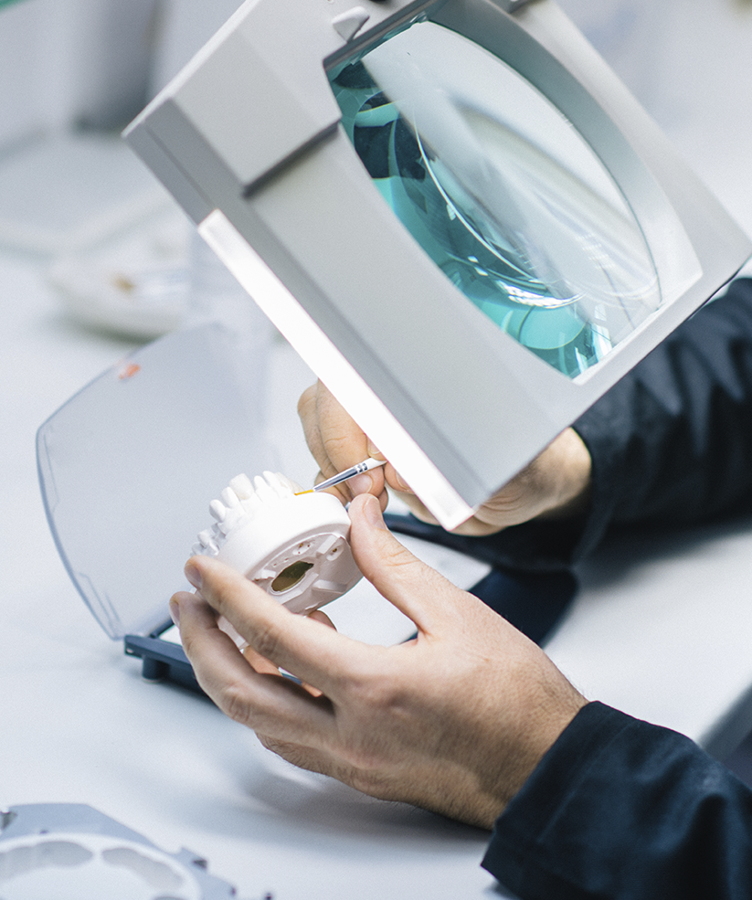 Usamos sistemas de producción digital para los archivos CAD: fresadoras, máquinas de sinterización y postmecanizado o sistemas de impresión 3D.